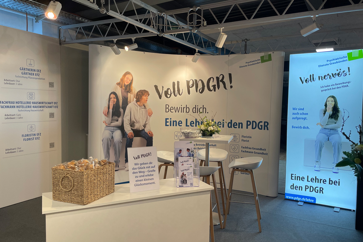 Auch die PDGR sind unter den rund 90 Ausstellern vertreten. Bis am Sonntag stellen wir uns als attraktiven Arbeitgeber im Gesundheitswesen vor und zeigen den jungen Besucherinnen und Besuchern unsere vielfältigen und spannenden Lehrberufe und Weiterbildungsmöglichkeiten.
